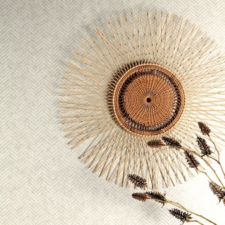 A két eltérő árnyalatú cikk-cakk vonalban haladó csík, Chevron mintát kölcsönöznek a tapétának. Minta ismétlődés 32 cm. Khroma Kefir Linen HIA 401.