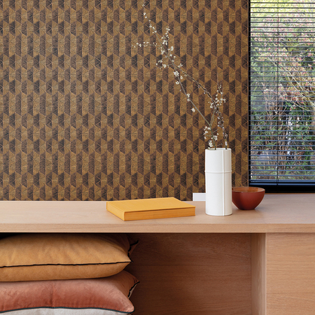 Hatszög mintás, enyhén 3D hatású tapéta. Mintaismétlődés 16 cm. Khroma Orbital Vector Honey ORB704 tapéta.